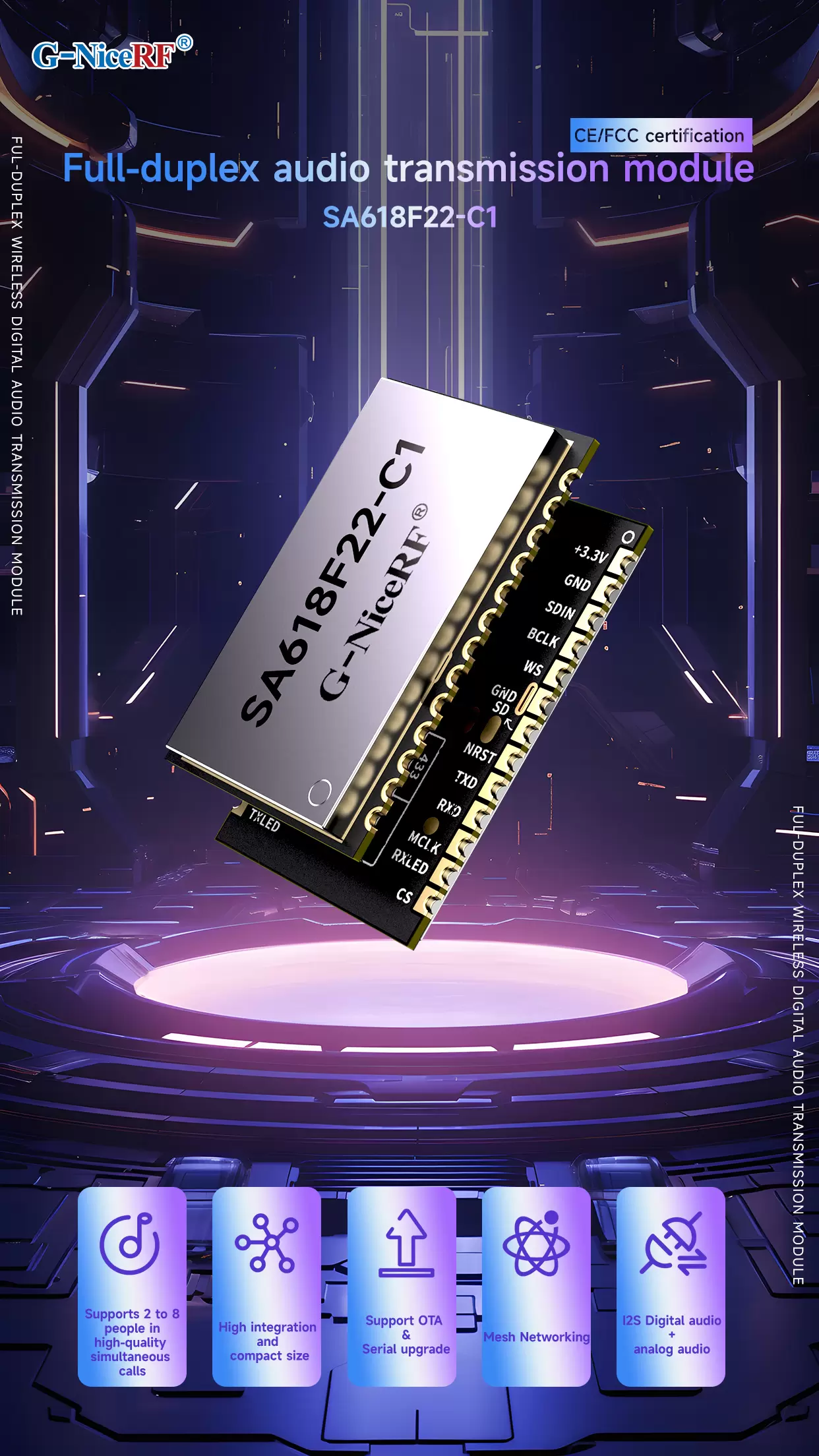 SA618F22-C1 — это модернизированный беспроводной полнодуплексный модуль передачи цифровых и аудиосигналов «все в одном» от NiceRF, поддерживающий 8-канальные одновременные высококачественные вызовы. Пользователи могут не только осуществлять беспроводную передачу данных через последовательный порт, но и передавать голосовые сигналы через цифровые аудио- или аналоговые аудиоинтерфейсы I2S. Этот модуль оснащен высокоскоростным микроконтроллером, схемой эхоподавления, защитой от электростатического разряда, высокопроизводительным радиочастотным чипом и усилителем, использующим технологию широкополосного расширения спектра, обеспечивающим низкое энергопотребление, передачу на большие расстояния и гибкую регулировку частоты. Кроме того, SA618F22-C1 оснащен аппаратным сторожевым чипом для предотвращения сбоев системы и имеет схемы защиты от обратной полярности, защиты от перегрузки по току и перенапряжения, обеспечивающие безопасность и стабильную работу устройства в различных средах.