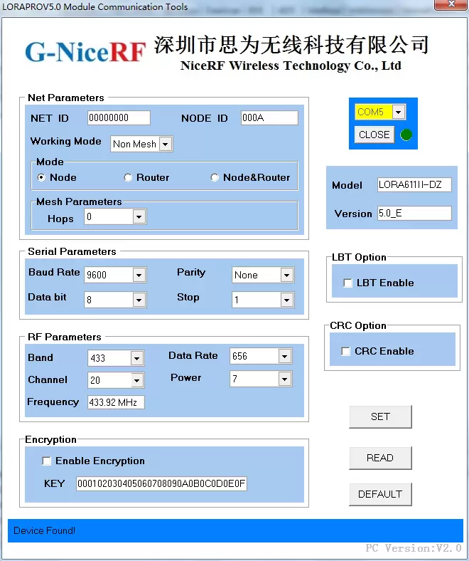 После правильного подключения модуля он переходит в состояние «настраиваемых параметров». Пользователи могут изменять соответствующие параметры модуля через интерфейс ПК, такие как: рабочий диапазон частот, каналы передачи и приема, скорость воздушной связи, мощность передачи; скорость передачи данных последовательного порта, биты данных, стоповые биты, биты четности; NET ID, NODE ID, ключ и т. д. Затем, нажав кнопку 【SET 】, можно настроить модуль. После каждого успешного изменения параметра будет отправлено сообщение «ОК». Программное обеспечение ПК должно отобразить диалоговое окно с подсказкой об успехе после получения ответа «ОК»; в противном случае в диалоговом окне отобразится «ОШИБКА», указывающая на ошибку операции. Если в течение 0,5 секунды после отправки команды ПК нет ответа, предполагается, что произошла ошибка связи, и должно отобразиться диалоговое окно с ошибкой операции. Установленные таким образом параметры сохраняются даже после отключения питания. Когда пользователь нажимает кнопку 【ЧИТАТЬ 】, модуль возвращает всю текущую информацию о параметрах модуля. Нажатие кнопки 【DEFAULT 】приведет к сбросу параметров модуля к заводским значениям по умолчанию.