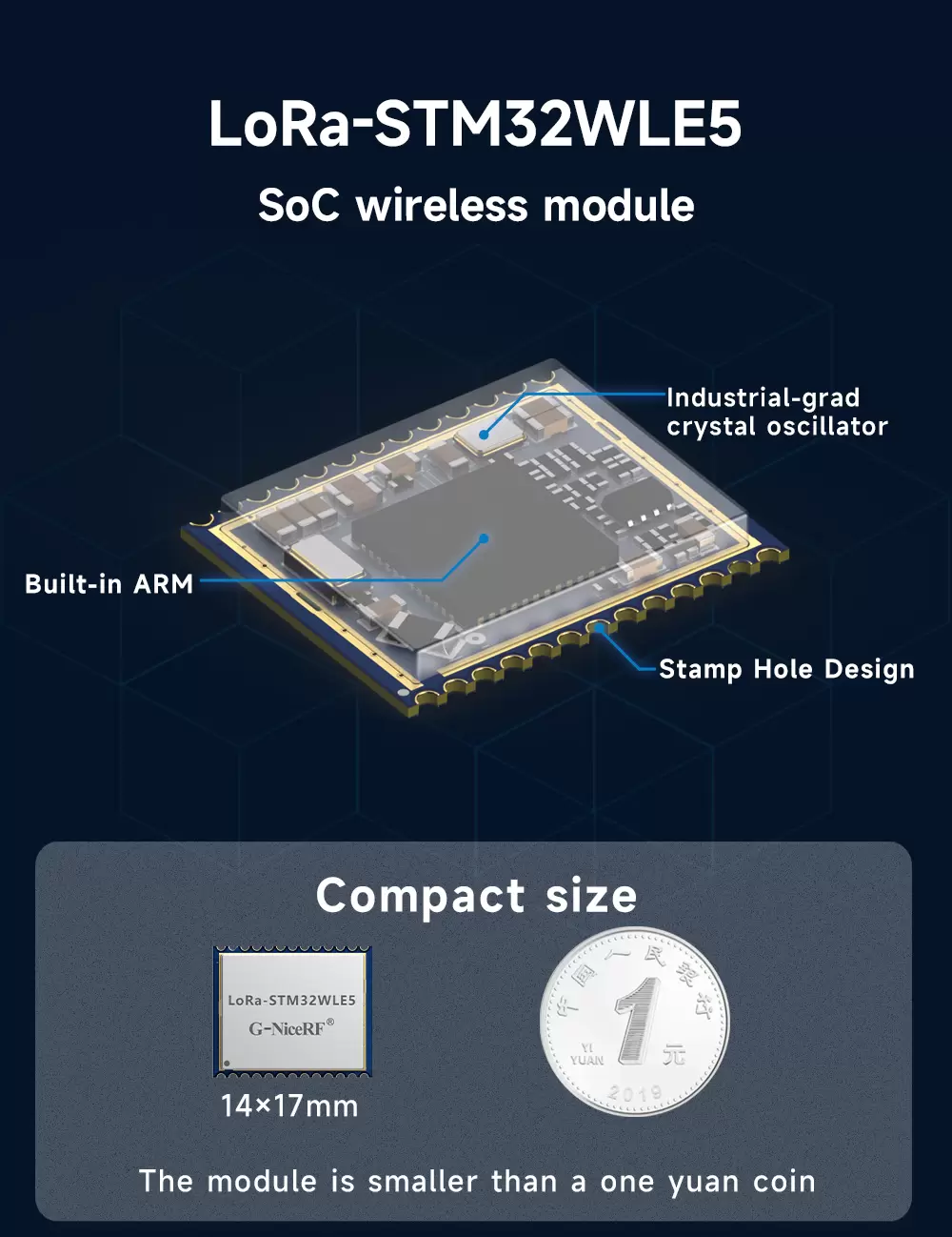 Беспроводной модуль SOC имеет объем 17*14 (мм) и сверхмалую конструкцию отверстия для штампа, что облегчает вторичную разработку пользователями. Встроенный 32-битный RISC-ядро Arm® Cortex®-m4 в сочетании с кварцевым генератором промышленного уровня с температурой 40–85°C позволяет использовать его в приложениях промышленного уровня.