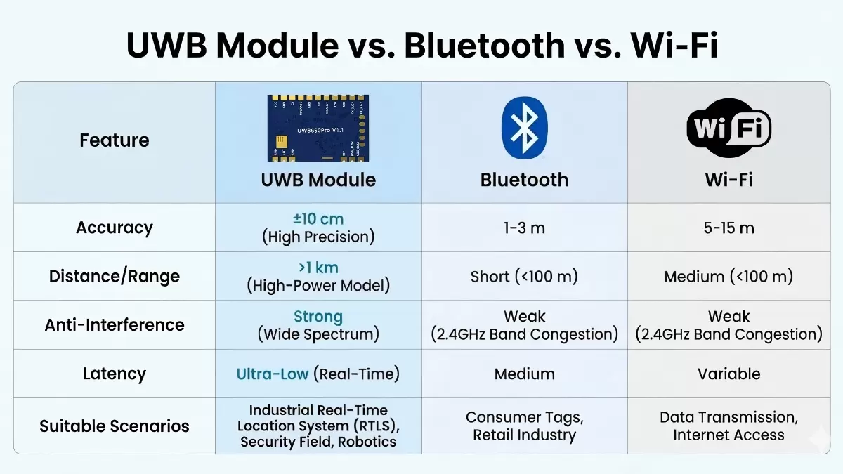 Внутри помещения сигналы GPS наталкиваются на препятствие. Они быстро затухают, делая обычные инструменты позиционирования бесполезными. Для отраслей, где важна точность, это не просто проблема; это снижает производительность и повышает риски безопасности. Bluetooth 5.1+ и Wi-Fi 6 достаточно хороши для общего зонирования, но они не могут обеспечить сантиметровую точность, необходимую для промышленной автоматизации. Именно здесь на помощь приходит сверхширокополосная  (UWB) технология, которая является практичным решением для промышленных сред.